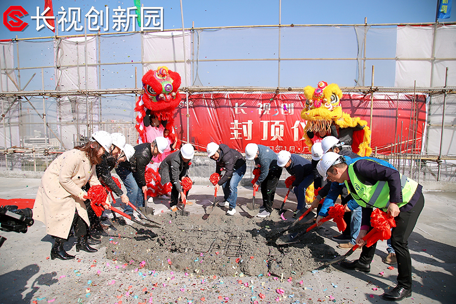 典礼最初一环,各带领和宾客移步到楼顶用铁锹封顶,象征着长视立异园封顶典礼美满竣事。