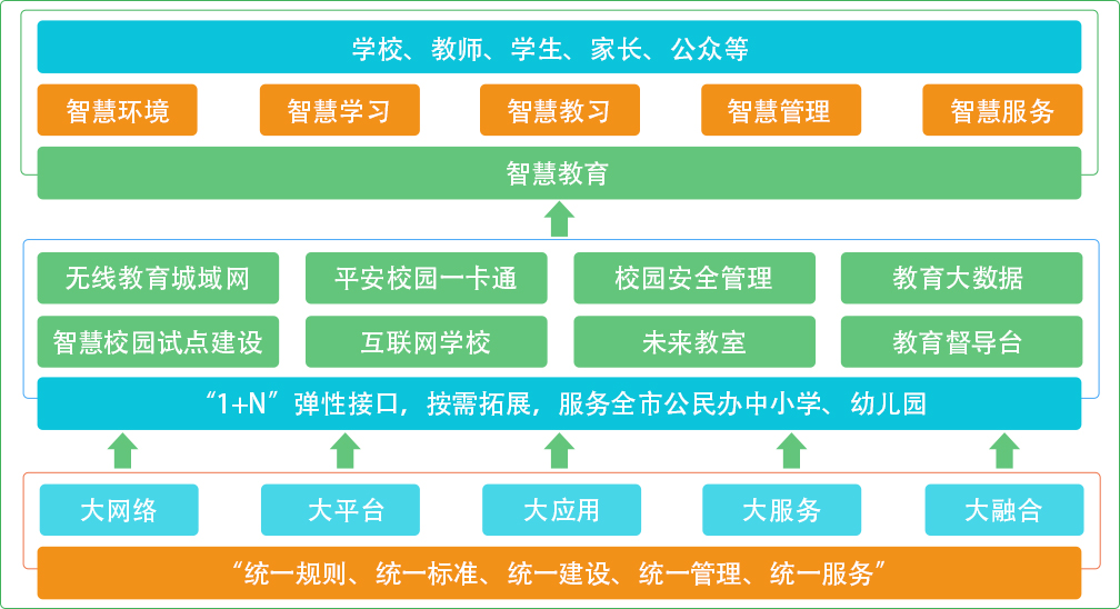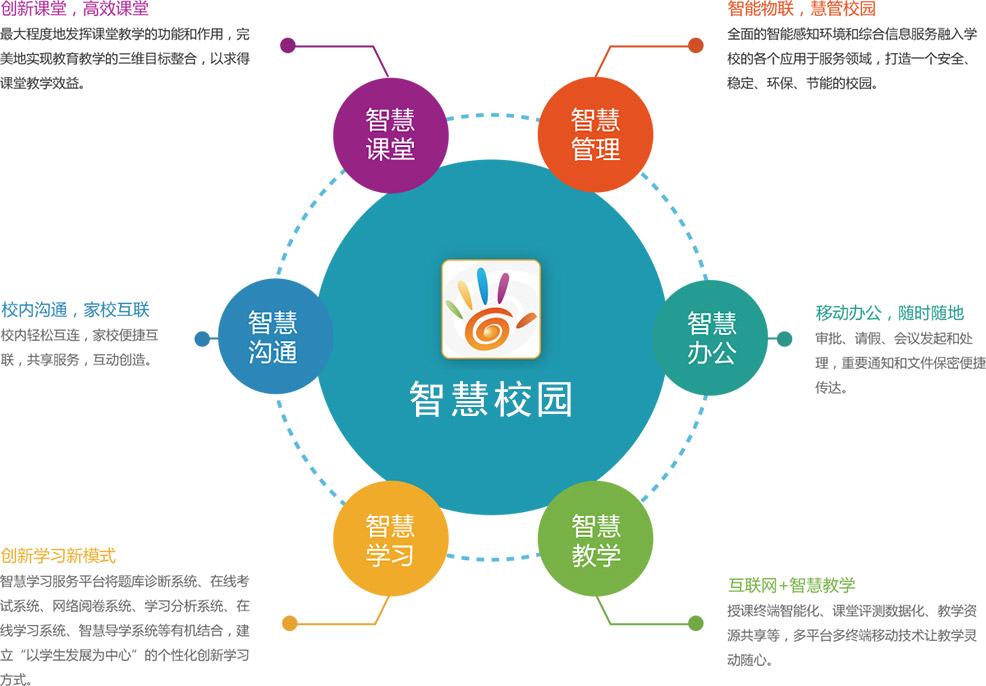 聪明教导接纳“五同一”(同一计划、同一规范、同一扶植、同一办理、同一办事)的扶植思绪,“五位一体”(大搜集、大平台、大操纵、大办事、大融会)的扶植形式,慢慢完成我市教导聪明情况、聪明进修、聪明讲授、聪明办理和聪明办事的扶植方针,周全办事黉舍、师生、家长及社会公家。